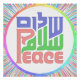 The word Peace written in English, Hebrew and Arabic surrounded by a multicolored border
