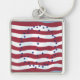 A painting of fifty blue stars on a red and white striped flag, by Cheryl Paton, is printed on custom keychains.