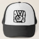 Simple message of peace, in bold black and white. Icon style doodle graphic of a hand making the peace sign V with the fingers in black.