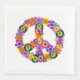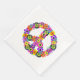 This paper napkin has a floral peace sign in shades of pink, turquoise, yellow, orange, purple, green and black.