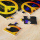 Yellow, gold, and red tinted peace signs with lots of multicolored rainbow hearts spread the anti-war message artfully and clearly.