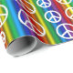 Abstract art of different sized white peace signs with a vertical rainbow as a background.