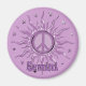 The sun and the symbol for peace celebrate your birth month in lavender, lilac, and purple with stars.