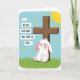 The front design shows a plump white bunny with soft rounded shapes, pink blush on its cheeks, and pale pink inside its ears, resting with eyes closed against a rustic brown wooden cross 🐰. The bunny’s relaxed pose and slight smile suggest a tender, trusting closeness, as if leaning into a steady companion. On the left side, three stacked white rectangles hold uppercase text that reads “...BECAUSE EVERYTHING COMES FROM THE LORD...,” set in dark lettering for strong contrast. The cross stands tall near the center-right, its wood grain hinted with simple shading and slightly uneven edges. Below, a green grassy foreground stretches across the bottom, adding a gentle outdoor setting. Above, a clear blue sky fills most of the background, keeping the scene open and calm. In the upper right corner, a partial yellow sun peeks in with small triangular rays, and a tiny 🌷 sits near the grass line.
