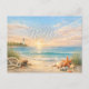 This serene New Year design captures the calm beauty of a coastal sunrise. Gentle waves roll onto a sandy shore scattered with seashells and bright starfish, while soft dune grasses frame the foreground. A weathered rope and driftwood add rustic seaside charm, leading the eye toward a distant lighthouse standing against a glowing pastel sky. Warm golden light reflects across the ocean, blending with tranquil blues and soft peach tones to create a soothing atmosphere. Elegant script lettering floats above the horizon, complementing the peaceful, reflective mood of welcoming a fresh new beginning by the sea.