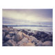 A panoramic view of a rocky coastline with a vast expanse of water stretching out in the distance. The sky is a soft, muted purple with wispy clouds, and a flock of pelicans flies in formation across the frame. The foreground is dominated by large, gray and brown boulders, weathered by the sea. The water is calm and reflective, with a hint of blue in the distance. The image was taken at Pebble Beach, California.
