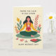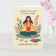 Designed with a calm, nature-inspired illustration, the card shows a dark-haired woman sitting cross-legged on a rich green patch, her eyes closed and face relaxed as if taking a quiet breath. She holds a smiling baby close in a bright red front carrier, and the baby’s cheerful grin adds a tender, affectionate touch ❤️. Around them, leafy branches and small flowers curve inward like a gentle embrace, mixing deep greens with warm yellow and coral accents. The background is a creamy beige with scattered reddish dots and small starburst shapes that give the scene a soft, dreamy look. Near the bottom, a baby bottle and a small stack of folded cloths sit neatly, hinting at everyday care without stealing focus. Any message text would sit comfortably above the figures, centered in a warm reddish tone that matches the carrier and dots. 🌼 The overall palette leans toward soft ochre, forest green, and coral red, with the botanical frame wrapping the edges and the tiny starbursts sprinkled across the open space.
