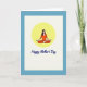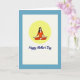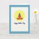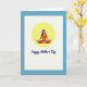 This card features a stylized woman seated cross-legged in a calm meditation pose, her hands gently forming a simple gesture that suggests care and closeness ❤️. She wears a warm orange outfit, and her dark hair frames a soft, friendly expression, like she’s sharing a quiet moment with someone she loves. A soft yellow glow circles her like a halo, adding a gentle, affectionate warmth against a lightly textured creamy off-white background. The layout stays minimal, letting the tender body language and relaxed posture do most of the talking. Near the bottom, the words “Happy Mother’s Day” appear centered in deep blue, written in flowing lettering that feels light and celebratory 🌼. A border of diagonal blue stripes runs around the edge, giving the design a neat frame and a steady rhythm. The colors balance warm orange and yellow with cool blue accents, keeping the scene soothing and intimate. The diagonal blue stripe border is evenly spaced and surrounds the main panel on all sides.