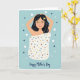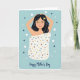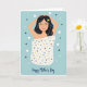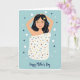 This card shows a calm morning scene on a soft sky-blue background sprinkled with small stars, where a relaxed figure with long dark hair rests under a cozy blanket. Her arms are lifted with hands behind her head, and her closed eyes and gentle smile suggest the kind of comfort you feel when someone cares for you ❤️. A tiny yellow star sits in her hair like a sweet little accent, and a light blush on her cheeks adds a tender, affectionate mood. The blanket is filled with warm tones and scattered patterns—yellow dots, brown circles, and small blue stars—that echo the night-sky theme while still feeling snug. The overall layout keeps the illustration centered, leaving open space around it so the scene feels quiet and unhurried. Near the bottom, the text “Happy Mother’s Day” appears as a simple line in a darker color that stands out clearly against the lighter background 🌼. Small star shapes are spaced across the blue backdrop, with a few floating above the figure’s head.