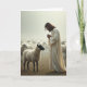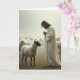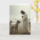 This design shows a calm pastoral scene where a long-haired, bearded figure in a flowing light robe stands with hands clasped, eyes lowered as if sharing a quiet, caring moment. In the foreground, a dark-faced, white-fleeced sheep stands close, its posture steady and attentive, like it’s listening in a gentle, wordless exchange 🐇. Soft, diffused light settles over the grass and warms the earthy ground tones, while the sky stays pale and slightly misty. In the distance, a large flock fades into the haze, their shapes growing lighter and less distinct as they recede. The overall palette stays muted—creams, soft grays, and browns—so the fleece texture and robe folds stand out. Any greeting text would sit neatly near the top in a light gray or soft brown, with a smaller line near the bottom in matching tones, leaving the figures unobstructed 🌷. The main sheep’s fleece catches the light in fine, curly detail against the darker face and the robe’s gentle drape.