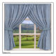 This fake window has a beautiful view... rural countryside of green fields lined with hedgerows and rolling hills. This traditional farmland is home to sheep and a thatched English cottage. It was photographed in Devon in the south of England, and shows a scene that could belong to times gone by. Semi-opaque drapes in blue stripe reveal this idyllic outlook, and add realism to the window illusion created by the white paned window-frame.