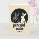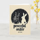 This card features a calm scene inside a circular frame, using deep charcoal shapes against a soft parchment background. At the center, a dark silhouetted hand forms a peace sign beside a long-eared bunny in profile 🐰, and their close placement feels like a quiet, friendly companionship. A tiny dark flower mark near the bunny’s feet adds a gentle, caring touch, like a small gift left in the grass 🌷. The circle’s interior reads like a night sky, dotted with tiny specks and a few larger star shapes that make the moment feel hushed and intimate. Short, stylized blades of grass sit along the bottom edge, grounding the figures in a simple outdoor setting. Beneath the circle, the words “peaceful easter” appear in flowing cursive lettering in charcoal, centered on the page. Under that line of text, three small charcoal dots are arranged in a neat row. The outer edge of the dark circle has a slightly rough texture, with the stars scattered unevenly across the background.