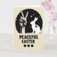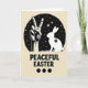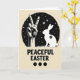 This design shows a warm creamy beige background with a large dark circular scene in the middle, filled with tiny white specks and scattered star shapes like a quiet night sky. Inside the circle, a detailed white human hand forms a peace sign, angled slightly toward a long-eared spring rabbit 🐇 as if the two are sharing a gentle, friendly moment. The rabbit’s white outline is smooth and calm, and a small floral mark on its side adds a soft touch of romance like a little gift 🌷. Along the bottom edge of the circle, a narrow strip of textured grass grounds both figures, making them feel settled together. Beneath the circle, the words “PEACEFUL EASTER” sit centered in thick, textured black lettering that stands out strongly against the beige. The text sits below the artwork with generous spacing, giving the main image room to breathe. The palette stays mostly black, white, and beige, letting the starry dots and the pale figures do the talking. At the very bottom, three solid black dots line up in a neat row under the message.