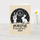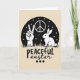 This design shows a dark circular night-sky scene floating on a warm pale beige background, like a quiet window into spring. Inside the circle, crisp white silhouettes show a raised hand making a V sign beside a small long-eared bunny 🐰, their closeness suggesting a gentle bond. A strip of sketchy grass runs along the bottom of the circle, grounding the figures as if they’re standing together under the stars. Tiny white stars and specks of pale “dust” scatter across the dark space, adding a soft, dreamy hush. Centered below the circle, the word “PEACEFUL” appears in large textured white letters, easy to spot against the beige. Just beneath it, “easter” is written in a thinner flowing black style, followed by three small black dots like quiet beats. The hand, bunny 🐇, and grass are all rendered in white, sharply contrasted against the deep dark circle with the starry flecks above.