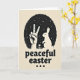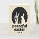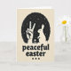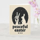 Designed with a warm, muted beige background, the card centers on a large, irregular dark circle that feels like a quiet night sky. Inside that circle, a pale human hand lifts two fingers in a V-shape, angled gently upward as if offering a friendly sign to someone close by. Near the hand, a long-eared rabbit silhouette 🐇 stands in profile, its head turned toward the gesture with a tender, attentive look. Tiny star-like specks scatter across the dark circle, while a small flower and a few thin grass blades 🌷 rise at the lower edge to hint at spring. Beneath the artwork, the greeting text sits centered in thick, textured lettering, followed by three small dots. The text is set in a dark ink that matches the circle, keeping the layout calm and cohesive. The dark circle is sprinkled with little light flecks, and the rabbit’s ears stretch up beside the raised fingers.