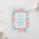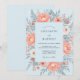 This design features a soft palette of peach and pale blue, creating an airy and romantic atmosphere. Lush peach peonies and delicate white blossoms are intertwined with dusty blue foliage, ferns, and sprigs of berries. The botanical composition offers a refined aesthetic perfect for a spring or summer event.