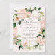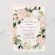 Design features a printed colored with floral element in shades of peach and cream over greenery leaves and hydrangeas with tulips blooms on a light peach watercolor background.. Great for your wedding celebrations!
