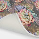 A small group of peach, green and purple succulents sit on top of a peach and gold colored transparent alcohol ink painting. The pattern is large as the images just barely overlap, and the bright pastel colors stand out against a dark gray background in this beautiful floral design.
