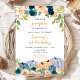 This cute and whimsical watercolor birthday party invitation features peach orange, baby blue and navy blue pumpkins and floral arrangements. The text combines handwritten script and sans serif fonts for a stylish and modern look. This is perfect for an autumn fall birthday party.
