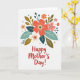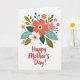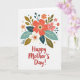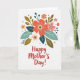 Designed with a lush floral crown filling the upper half, this card sets a gentle, affectionate tone like a warm hug ❤️. Coral and soft peach flowers mingle with pale pink blooms, while teal and olive-green leaves curl around them in a cozy, gathered arrangement. A creamy white blossom sits among the petals, its layered edges giving a soft, tender look that suggests care and closeness. Small golden star-like dots and a few round accents are sprinkled around the bouquet, adding a light twinkle without stealing attention from the flowers 🌼. Centered below the florals, the words “Happy Mother’s Day!” appear in flowing crimson lettering that stands out clearly. The text sits in the lower half with plenty of open white space around it, making the message easy to spot at a glance. The overall layout feels balanced and calm, with the bright reds and warm corals gently contrasted by cool greens. The background stays plain white, with the floral crown arcing across the top and tiny gold details scattered near the petals.