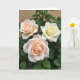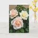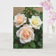 This card features three garden flowers in close-up, arranged like close companions leaning toward one another, with a gentle, affectionate closeness ❤️. Two blossoms in the foreground glow in blush-peach tones that fade to creamy edges, while a third bloom adds warmth with a buttery yellow center that softens into pale cream. Soft daylight falls across the petals, catching their velvety texture and making the curled layers feel tender and intimate, like a quiet exchange between friends. Deep green leaves surround the blooms, forming a natural frame that makes the lighter colors stand out. A short Mother’s Day message sits near the top in a light, warm color, with smaller text placed below in a matching tone for balance 🌼. The background stays softly out of focus in darker greens with a faint hint of earthy brown, keeping attention on the flowers. The front peach flower shows a tightly coiled center with spiraling petals highlighted by the diffused light.
