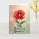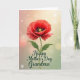 This design shows a single large flower in rich crimson-orange, its ruffled petals lightly veined as if reaching toward someone with a gentle, affectionate gesture ❤️. At the center, a near-charcoal core holds dark stamens circling a bright lime-green pistil, creating a close, intimate focal point like a quiet moment shared between close friends. The bloom rises on a slim green stem with two curved leaves that lean outward, adding a soft, embracing shape to the scene. Behind it, the background fades from a peachy blush near the top into a muted mint green near the bottom, keeping the mood calm and tender. Small, round light spots float across the backdrop like sunlit dust, giving the space a soft glow 🌼. Below the stem, a flowing message appears in dark green lettering with a faint light outline, centered near the lower portion of the card. The petals show fine texture and gentle shading, with the deepest tones gathered around the dark center. The lower area holds the dark green text beneath the flower, while pale bokeh circles drift over the peach-to-mint gradient.