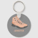 This keychain features an illustration of a hiking boot in peachy coral set against a gray background and is ready to be personalized with a name below in matching coral lettering.
