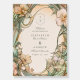 A romantic Art Nouveau wedding design featuring flowing peach and cream florals, interwoven with soft green botanical scrolls. This elegant illustration surrounds a vintage-style layout with graceful curves and ornate detailing, perfect for couples seeking a classic yet artistic wedding aesthetic inspired by nature and antique beauty.