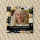 Celebration of life square funeral button featuring a stylish black background, elegant peach watercolor flowers, a photo of your loved one in a faux gold frame, their name, and birth/death dates.