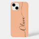 Peach Fuzz Elegant Black Calligraphy Script Custom Personalized Name iPhone 14 Smart Phone Cases features a modern and trendy simple and stylish design with your personalized name in elegant hand written calligraphy script typography on a peach fuzz background. Designed by ©Evco Studio www.zazzle.com/store/evcostudio