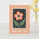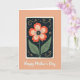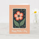 This card features a botanical illustration centered inside a dark indigo rectangle on a soft peach-salmon background, creating a cozy, affectionate mood ❤️. A large stylized flower sits in the middle, with broad petals shaded from coral to pale blush and fine lines radiating outward from a deep, shadowy center touched with a small golden-orange highlight. Two sage-green leaves rest beneath the bloom, their gentle vein details adding a calm, caring touch, like a quiet hug between close family or friends. Across the indigo area, tiny white dots scatter like soft drifting specks, while thin golden-orange tendrils curl and stretch as if reaching toward someone dear. A few of those tendrils end in small heart shapes and round dots, adding a sweet, romantic hint without overpowering the design 🌼. A slim creamy border frames the indigo panel, and along the bottom edge the phrase “Happy Mother’s Day” appears in light blue lettering. The hearts and curling golden lines float near the sides of the flower within the indigo panel.