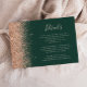 The left-hand edge of this elegant modern wedding details enclosure card features a peach faux glitter design. The customizable text combines pale peach handwriting, copperplate and italic fonts on a dark emerald green background. The reverse side features a matching peach glitter design.