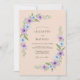This design features a soft peach background adorned with ethereal watercolor blossoms in lavender and pale blue. Delicate petals resembling anemones are paired with wispy sage green foliage for a light, airy feel. The painterly style evokes a romantic and whimsical mood, ideal for a seasonal spring or summer event.