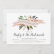 Celebrate your best girls with these chic bridesmaids brunch invitations. Design features a blush pink ribbon bearing the words "bridesmaids brunch" with peach flowers and green leaves peeking out. Personalize with your brunch details in inky off-black serif and calligraphy lettering.