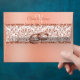 This elegant peach metallic envelope design is perfect for your peach colored wedding theme. The glitter damask across the flap and the closure is tied together with wedding rings. The flap has the monogram of the bride and groom in elegant script font.