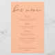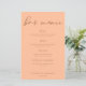 Peach is the new trending color for summer weddings. Our sweet peach wedding bar menu features elegant light brown script detailing your drinks for a trendy, minimalist event in the afternoon. Add your wine selections, beer, spirits, and other specialty drinks on this list.