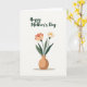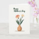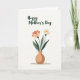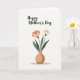 This greeting card features a calm floral illustration that feels like a gentle hug between close loved ones ❤️. Near the top, the words “Happy Mother’s Day” appear in a flowing dark green style, centered and easy to read. Below the text, a short terracotta-colored vase sits firmly in the middle, giving the layout a steady, grounded look. Two stylized flowers rise from thin dark green stems, leaning slightly toward each other as if sharing a quiet moment. One bloom is soft peach-orange with layered petals, while the other is creamy white with a warm golden-yellow center 🌼. Broad, angular dark green leaves frame the stems and add contrast against the warm vase and petals. The background is a light cream field with plenty of open space, keeping the focus on the message and the bouquet. A faint soft gray shadow rests just under the vase on the cream background.