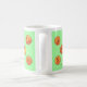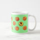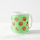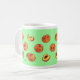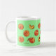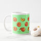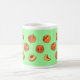 Mug with cheerful peach drawing design. Green background. This coffee mug with 17 different original peach drawings will brighten your morning and afternoon. Makes a great gift for yourself or others for any occasion.