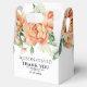 This floral wedding favor box features beautiful peach peony flowers alongside sage green foliage. The couple's names are showcased in an elegant decorative font. A heartfelt 'Thank You' message is included to show appreciation to the guests. To enhance the design, a sleek black thin line runs along the bottom, adding a sophisticated touch.