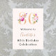A peach colored background. Decorated with foral numbers in faux gold and pink. Personalize and add a name and age.