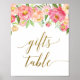 This peach and pink peony flower "gifts table" sign is perfect for an elegant girls baby shower. The floral design features a beautiful arrangement of watercolor peonies in shades of blush and coral matched with dainty faux gold foil calligraphy.