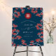 Oriental peach / plum blossoms, spring flowers in red with light pink branches on a dark navy blue background with a simple round circle double happiness symbol wedding welcome sign. An elegant and romantic floral chinese themed wedding design which is whimsical, modern and classy.