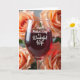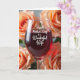 This greeting card features a glowing stemless glass filled with deep crimson liquid, set against a softly blurred garden of roses in apricot and peach tones. The glass sits near the center, catching gentle light that creates a small shine along its rim and a smooth reflection on the bowl. Surrounding blossoms fade into a bokeh-style background, like a close, cozy backdrop to a quiet toast shared between two people ❤️. The rich red drink contrasts with the warm pastel flowers, adding a romantic, candlelit feel without showing any faces. A short celebratory greeting is printed directly on the glass in thin white lettering, placed across the middle where it stands out clearly. The roses frame the scene from both sides, with a few blooms appearing closer in the lower corners, like they’re leaning in toward the glass 🌼. The peach and apricot petals blur into soft circles of light behind the centered glass and its white message.