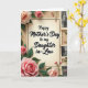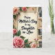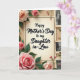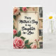 This card features a cream, parchment-like center panel framed by a thin black border, with the message “Happy Mother’s Day to my Daughter in-Law” placed prominently in the middle in dark lettering ❤️. Behind it sits a warm beige paper background with softly distressed texture and gently torn edges, like a treasured letter kept in a drawer. Full roses in soft peach shifting into bright pink curl around the corners and along the left side, their layered petals leaning toward the message as if offering a quiet embrace. Deep green leaves and a few small rosebuds fill in the gaps, adding a tender, garden-fresh touch without crowding the space. Along the right edge, a vertical strip of small black-and-white photos adds a nostalgic, family-album feel, with uneven borders that suggest well-loved prints. The photos hint at people, buildings, and gatherings, creating the sense of shared moments and close bonds 🌼. Soft, diffused lighting keeps the palette gentle while still letting the flowers and border stand out against the aged-paper backdrop. The right-side photo strip is stacked from top to bottom in a narrow column, each tiny image separated by a small margin on the beige background.