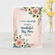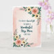 Designed with a soft cream center panel, this card features the message “IT IS SUCH A Special Gift TO HAVE A Wonderful Step Mom LIKE YOU” arranged as the main focus. Some words appear in flowing cursive-style lettering while the rest is in a simple, easy-to-read print, all in dark ink for clear contrast. In the top-left and bottom-right corners, floral clusters frame the text like gentle bookends, creating a caring, close-to-the-heart feel ❤️. The flowers include full peach roses with tightly curled petals, mixed with small yellow and white blooms that have dark centers, tucked into leafy green stems. Tiny red berries peek out between the leaves, adding little sparks of color that feel like affectionate details shared between close family 🌼. Around the cream panel, a translucent blush pink wash spreads outward like soft watercolor, giving the layout a tender, romantic glow. The peach roses sit against the green foliage with the darker flower centers standing out near the corner edges.