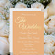 Simple style wedding invitation on a trendy, peach color background with "The Wedding" printed in stylized script with foil color of your choice. Edit name, date, location, etc., with your own information printed in white, stylized lettering. Designed to coordinate with our Peach Simple Style Wedding collection.