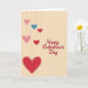 This Valentine's Day card features a sweet shower of hanging hearts that look like they’re suspended from thin strings. Each heart is outlined with tiny white stitch marks, like sewn fabric, which adds a cozy handmade feel. The hearts come in soft pinks, rich reds, and one calm blue, all set against a warm beige background. A large red heart sits near the bottom and draws your eye, while the smaller hearts above it feel light and cheerful. On the right side, the card says “Happy Valentine’s Day” in a flowing script style, in a light color that stands out gently from the background. The whole scene feels warm, caring, and perfect for romance, friendship, or a simple thank-you to someone special ❤️💌🍫.