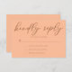 Peach is the new trending color for summer brides. Our sweet peach wedding response card features elegant light brown script for a trendy, minimalist event in the afternoon. RSVP under the cursive script that reads Kindly Reply.