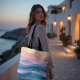LUVINK Modern Coastal Luxury. Peach Swell unfolds in sweeping bands of sunset peach, soft lavender, and deep teal, rhythmically flowing across a sandy-hued canvas. The abstract wave motif evokes the serene pulse of twilight tides. This elegant tote is perfect for beach days, market runs, or adding an artful coastal accent to any outfit.