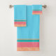 This towel set features tropical poolside colors! A textured peach colored design border with teal and coral stripe accents make for that exotic beachy feel. Customize the bright blue background to any color you need. A pale pink is really nice.